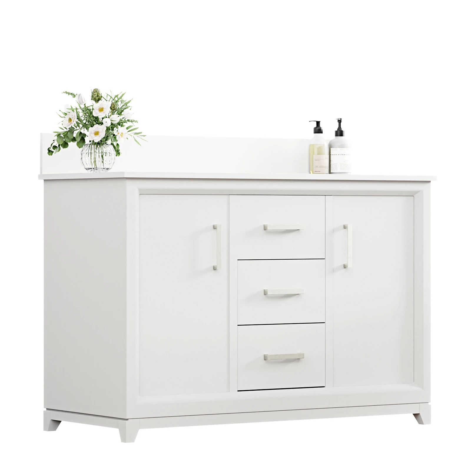 - Spacious Storage: With three drawers, two doors, and two basin areas, this 48 inch double bathroom vanity offers ample storage space for your toiletries, towels, and other bathroom essentials.