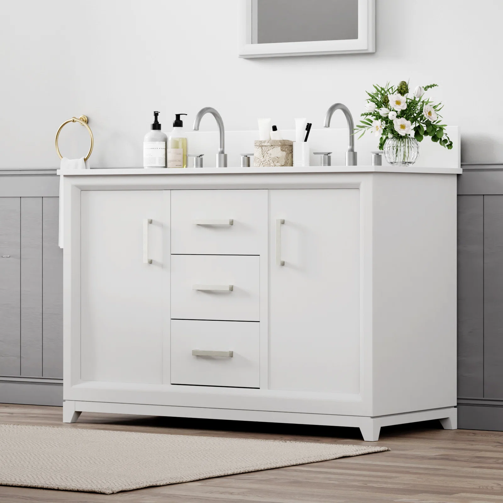 Upgrade your bathroom with our exquisite 48-inch double bathroom vanity. This sophisticated piece is crafted from a combination of solid wood and medium-density fibreboard (MDF), ensuring both durability and elegance. The double vanity design offers ample storage with multiple drawers and cabinets, providing plenty of space to organize toiletries, towels, and other essentials. Additionally, the spacious countertop allows for easy placement of bathroom accessories and daily necessities, making this vanity not only a stylish focal point but also a highly functional addition to your bathroom.
