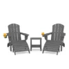 The 5-Piece reclining adirondack chair set is the perfect outdoor furniture set for ultimate relaxation. This set includes 2 chairs, 2 footstools, and 1 side table. This is perfect for afternoon tea, providing a convenient space for drinks and snacks. The backrest features 3 reclining positions for the most comfortable sitting experience. Made for the outdoors, this all weather adirondack chair set is perfect for your patio, deck, or garden.