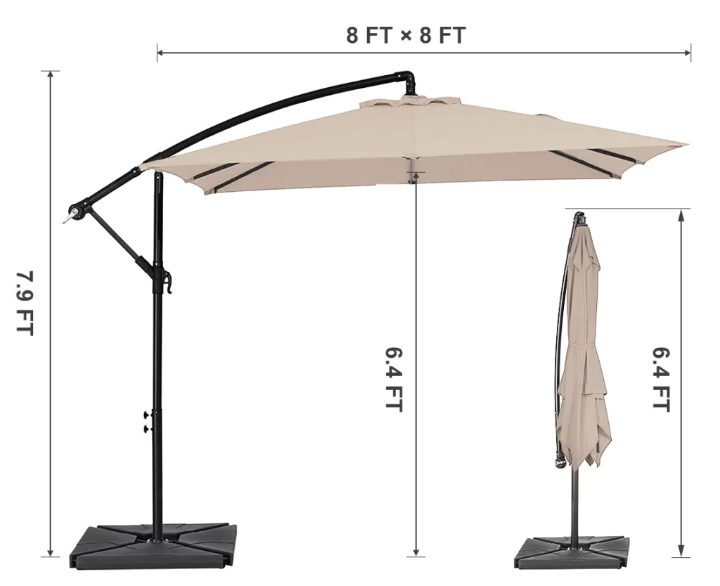 - Durable material: The square offset umbrella is made of 180GSM solution-dyed fabric with a water-repellent coating. This durable material provides UV protection and is resistant to fading, stains, and water damage.