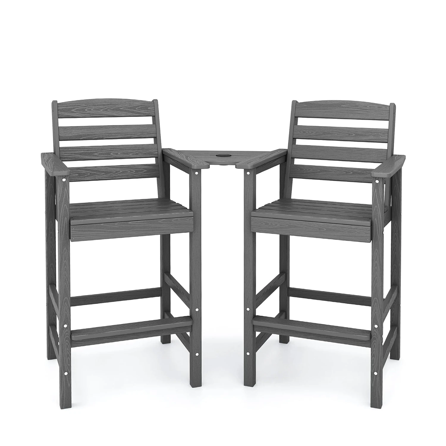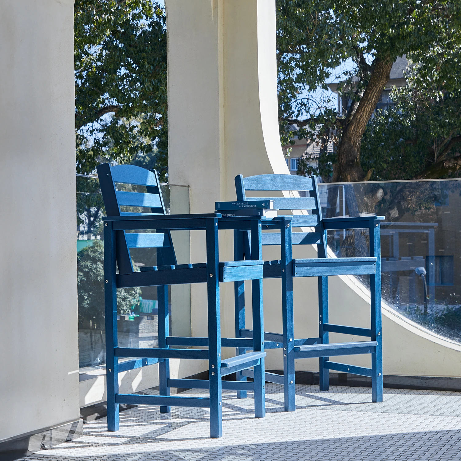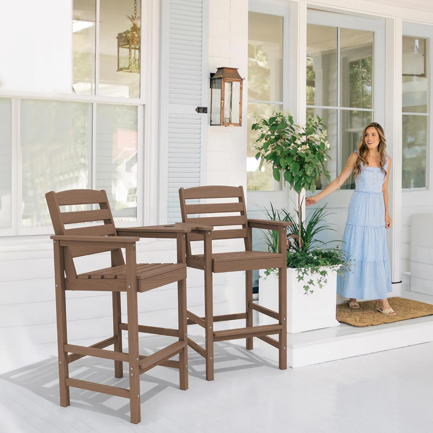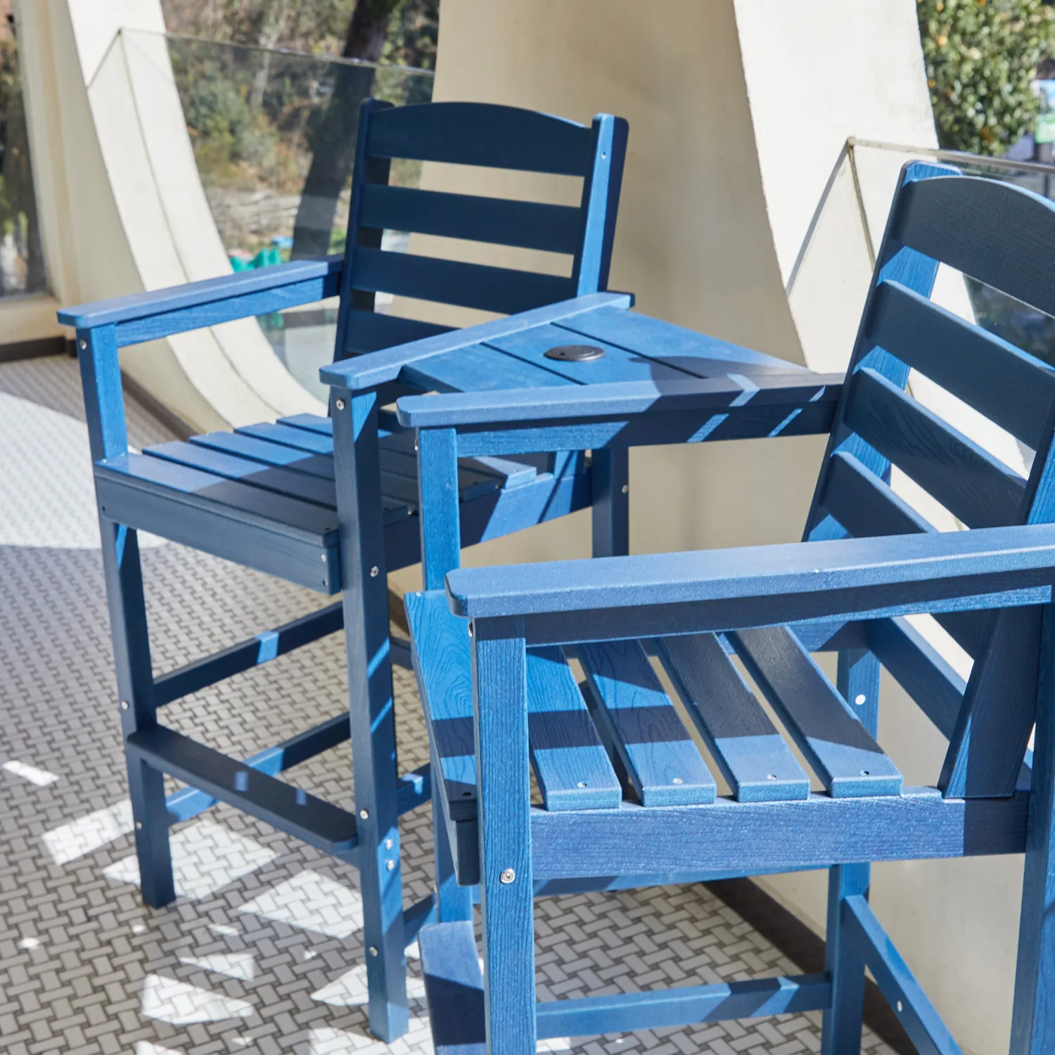 Opt for our low back bar arm chairs with a connecting table to elevate your outdoor bar gatherings. These chairs are crafted from weather-resistant HDPE plastic, boasting a classic wood grain finish that retains its charm without the need for painting, staining, or protective coatings. The connecting table enhances functionality by providing a convenient surface for drinks and snacks, making it ideal for entertaining guests or enjoying a relaxing evening outdoors. Whether hosting a lively gathering or a casual get-together, the bar arm chairs and table set combine style and practicality to enhance your outdoor entertainment space.