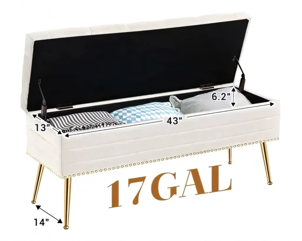 - Elegant Design: Our modern storage bench boasts a timeless yet modern design, blending classic elegance with luxurious velvet fabric and golden accents. It’s a statement piece that enhances the ambiance of bedrooms, entryways, and living spaces.