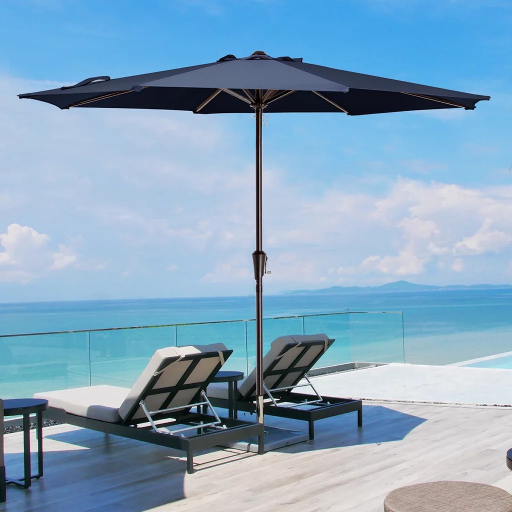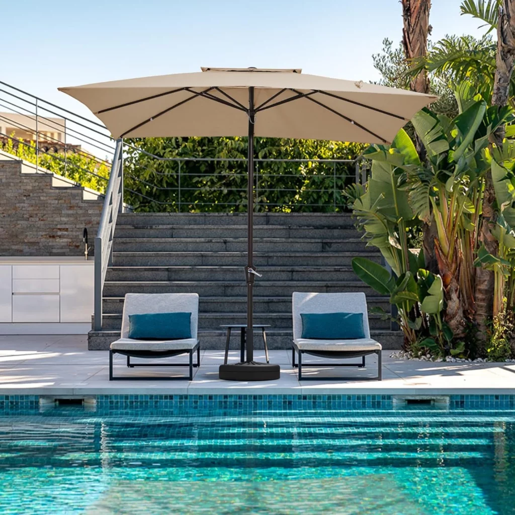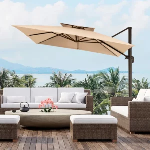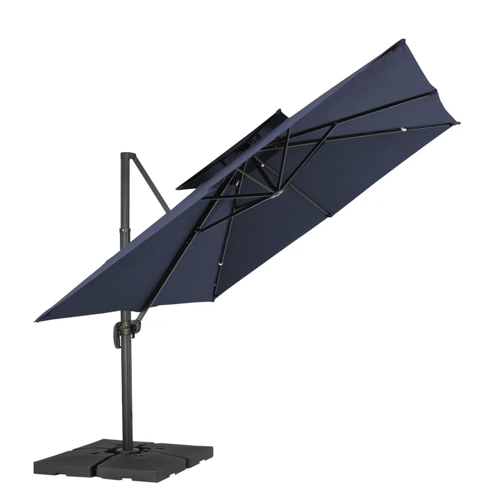 This offset hanging umbrella comes with an umbrella base and can withstand winds up to 40 mph. You can add a weighted umbrella base for even greater stability and sturdiness. The offset frame design perfectly combines practicality and style, allowing you to adjust the shading angle according to the changing sunlight for maximum protection. Redefine the coolness of your outdoor life with our offset patio umbrella.